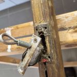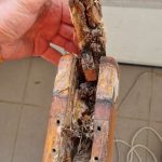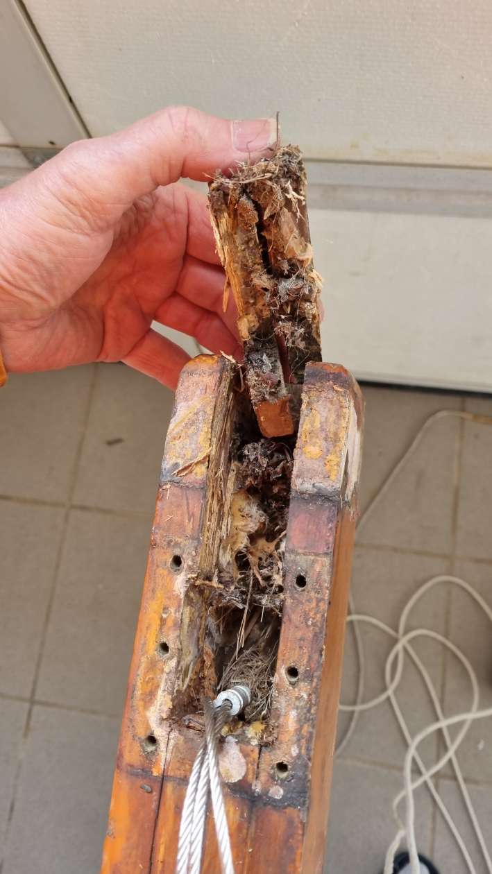 Der Mastfuß war unten zum Teil so morsch, dass er fast zu Staub zerfiel. Da ist es dann wohl nicht mit etwas Schleifpapier und Farbe getan. Als erstes fräste Skipper all das tote Holz weg bis sich „festes Fleisch“ fand. Dann laminierte er Carbon Stäbe zur Verstärkung in den entstandenen Hohlraum ein. Damit waren die Seiten soweit wieder modelliert. Nun sägte er aus sehr hartem Cumaru Holz zwei Klötze aus die in die Mitte eingebaut wurden. Die noch vorhanden Risse und Unebenheiten hat er verspachtelt und eben geschliffen. Zum Schluss wurde der Fuß dann noch mit Glasgewebe mehrfach ummantelt.