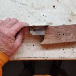 Der nächste Mangel, den es zu beseitigen galt, war die eingerissene Nut am Mast in der das Großsegel eingeführt wird. Die ist auf der Steuerbordseite auf eine Länge von 2 Metern eingerissen. Die erste Idee, den Riss mit Holzleim zu kleben, verwarf er bald. Der Riss war zum Teil so dünn, dass dort der Leim nicht tief genug hätte eindringen können. Aber es gibt ja noch das dünnflüssige Epoxyd.