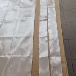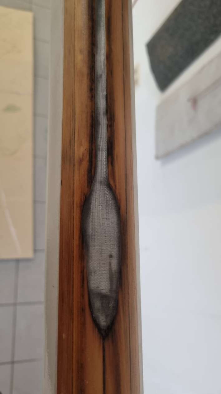 Das hat er mit einer feinen Nadel in den Riss injiziert. Anschließen hat er die Nut fixiert und das Epoxyd aushärten lassen. Ein paar Tage später war wunderschönes Frühlingswetter und die Sonne schien schön warm. Da kann man prima draußen an der frischen Luft den Mast von dem alten Lack befreien. Damit die Nut auch dauerhaft hält, wollte er noch ein sehr feines Glasgewebe über den Riss laminieren. Da der Holzmast flexibel bleiben sollte konnte er nicht den ganzen Mast einwickeln sondern nur je einen schmalen Streifen rechts und links der Nut. Das ging am besten, indem er die Nut mit einem Steifen überklebte und sie so eigentlich zunächst versiegelte.